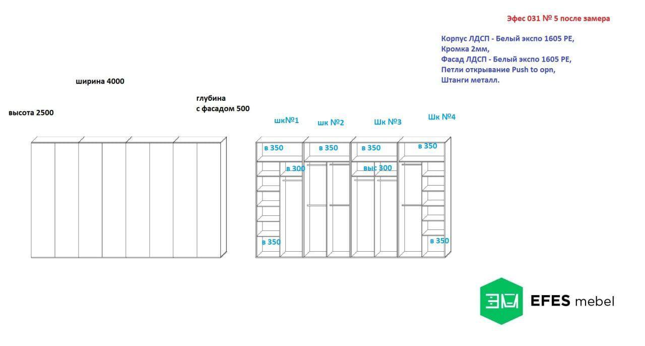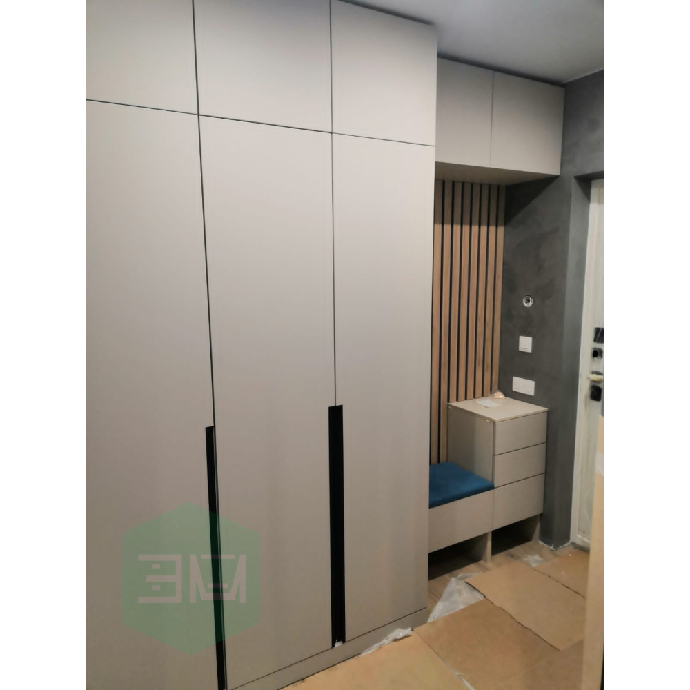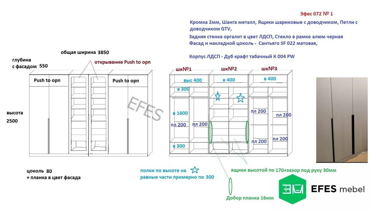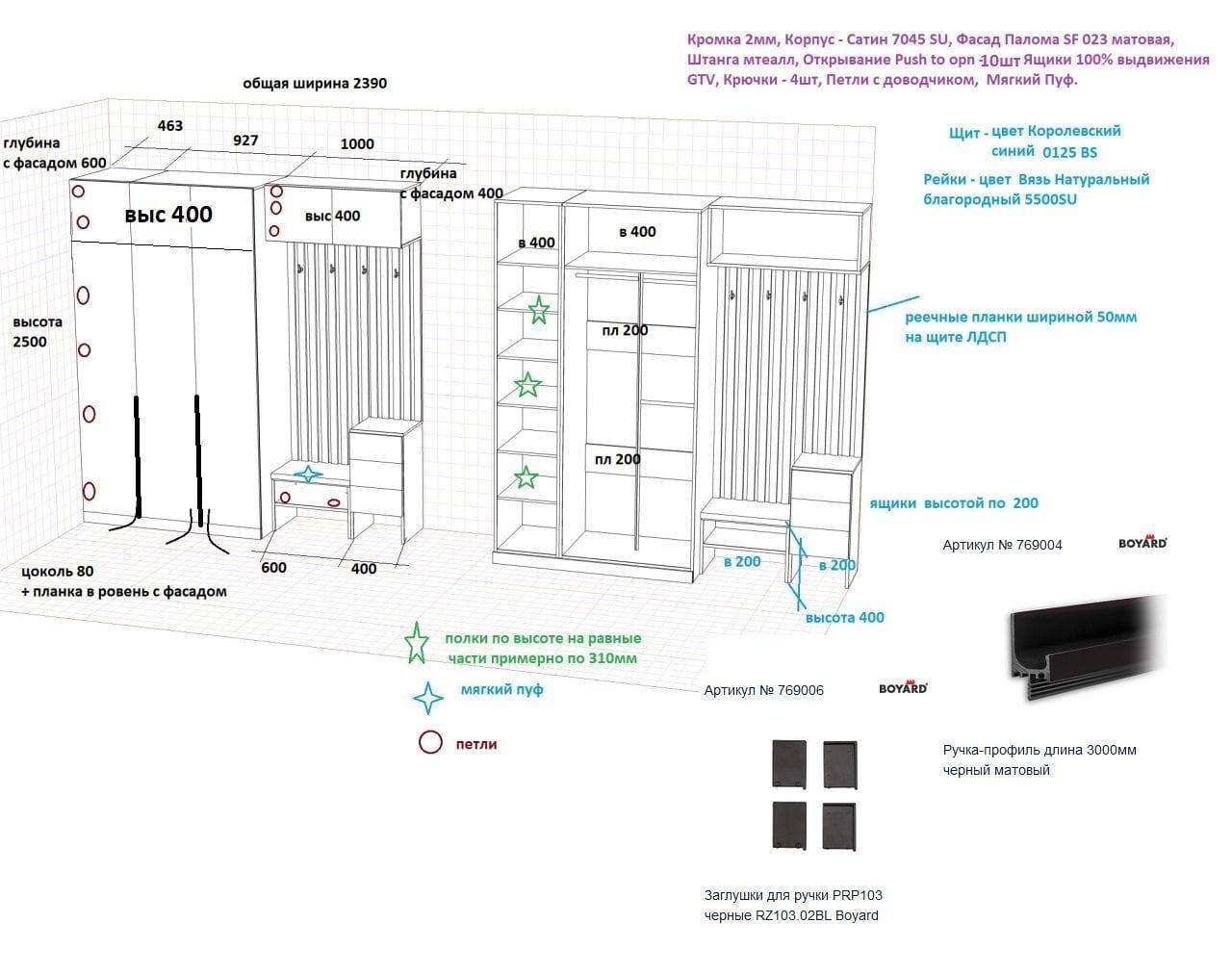 Прихожая. Размер: 2390*2500*600. Корпус ЛДСП сатин. Кромка 2 мм. Фасад МДФ сантьяго. Рейки ЛДСП вяз натуральный благородный. Щит за рейками королевский синий. Штанги металл+тройник+крестовина. Ручки на больших фасадах. Открытие пуф, антресоли - пуш клик. Направляющие на ящиках 100% GTV. Петли с доводчиками. Пуф ткань вельвета люкс 54 (адилет) |