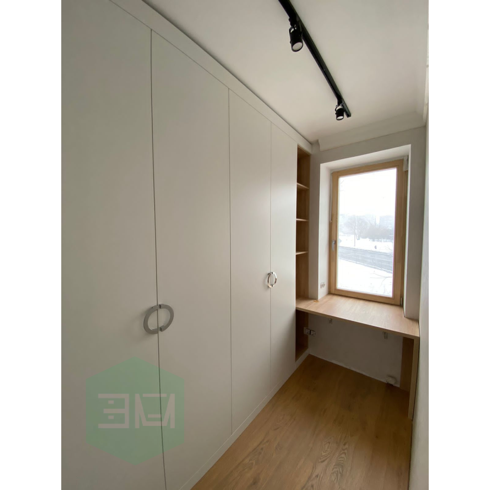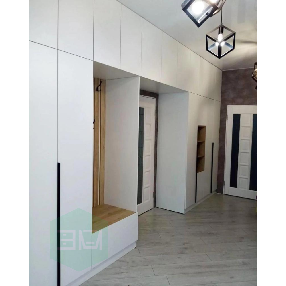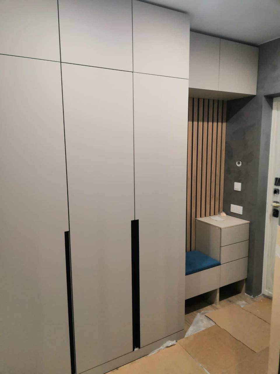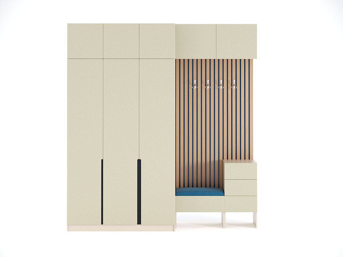Прихожая. Размер: 2390*2500*600. Корпус ЛДСП сатин. Кромка 2 мм. Фасад МДФ сантьяго. Рейки ЛДСП вяз натуральный благородный. Щит за рейками королевский синий. Штанги металл+тройник+крестовина. Ручки на больших фасадах. Открытие пуф, антресоли - пуш клик. Направляющие на ящиках 100% GTV. Петли с доводчиками. Пуф ткань вельвета люкс 54 (адилет) |